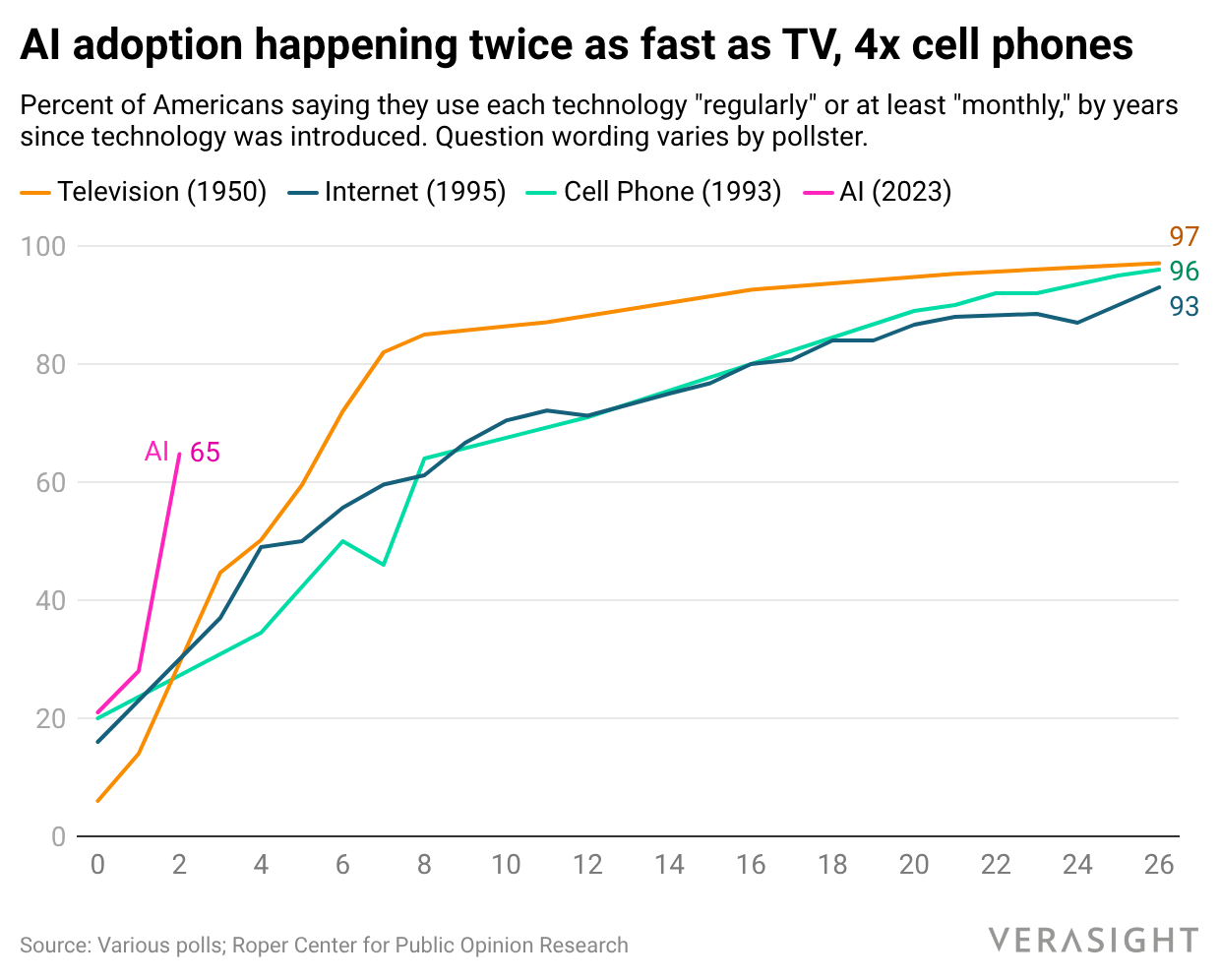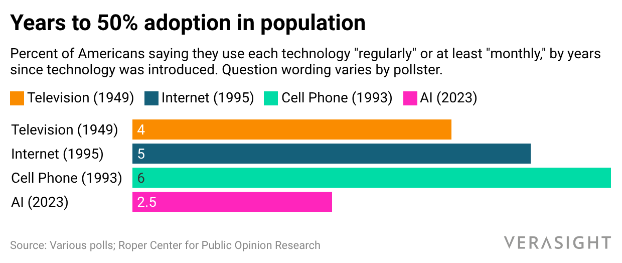 According to a Verasight survey fielded from Dec. 22, 2025 to Jan. 6, 2026, 64% of American adults used AI tools in their work or personal lives at least once in the past month. As the chart below shows, that pace of adoption is about twice as fast as television in the 1950s and roughly four times faster than cell phones in the 1990s, the steepest adoption curve for any major consumer technology on record.