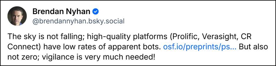 Verasight’s reaction was more sanguine. We explained how Verasight’s long term strategies to ensure attentive and representative human samples also worked to prevent AI fraud (see, here and here).