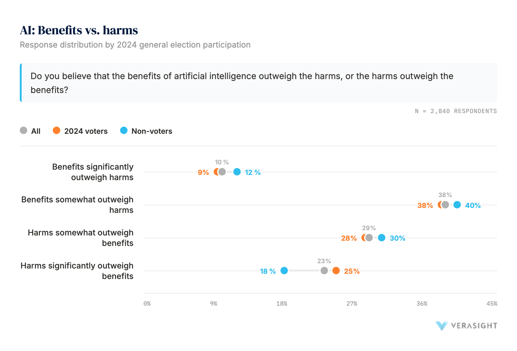 Most surveys on artificial intelligence poll the general adult population. This one samples 2,840 registered voters who Verasight has verified as voters using commercial voter files. This also lets us break out opinions by whether someone participated in the 2024 primary and general elections. In our new survey, voters are more in favor of government regulation for, and more skeptical of, AI than non-voters, while Democrats are the most worried about AI’s impacts on employment, and Republicans see more upside in the technology than other voters.