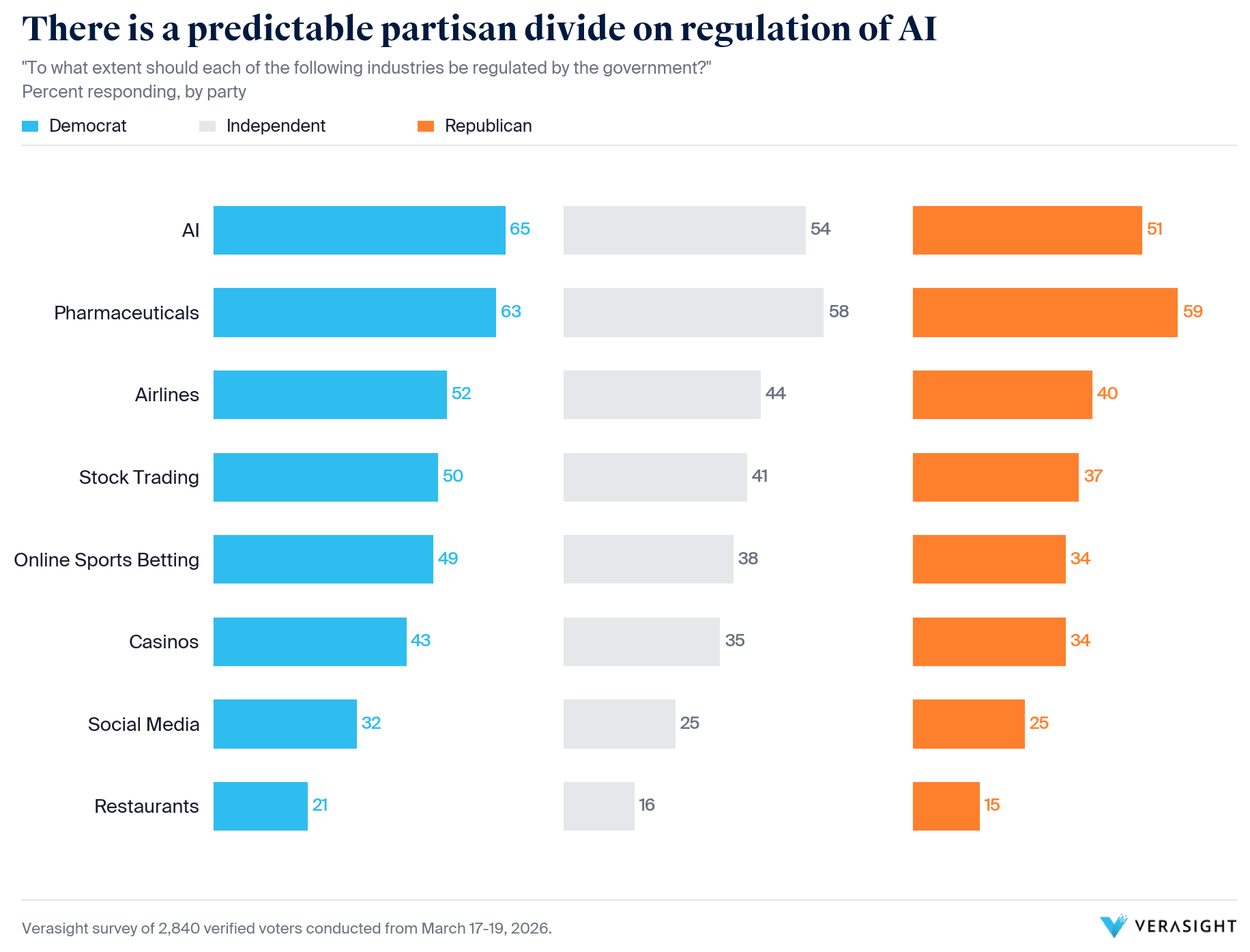 The industry comparison is worth sitting with. Social media – which has been the subject of Congressional hearings and years of public debate – comes in well below AI, suggesting people see AI as posing a different, more serious kind of risk. Support for AI regulation is higher than for casinos, sports betting, and stock trading.